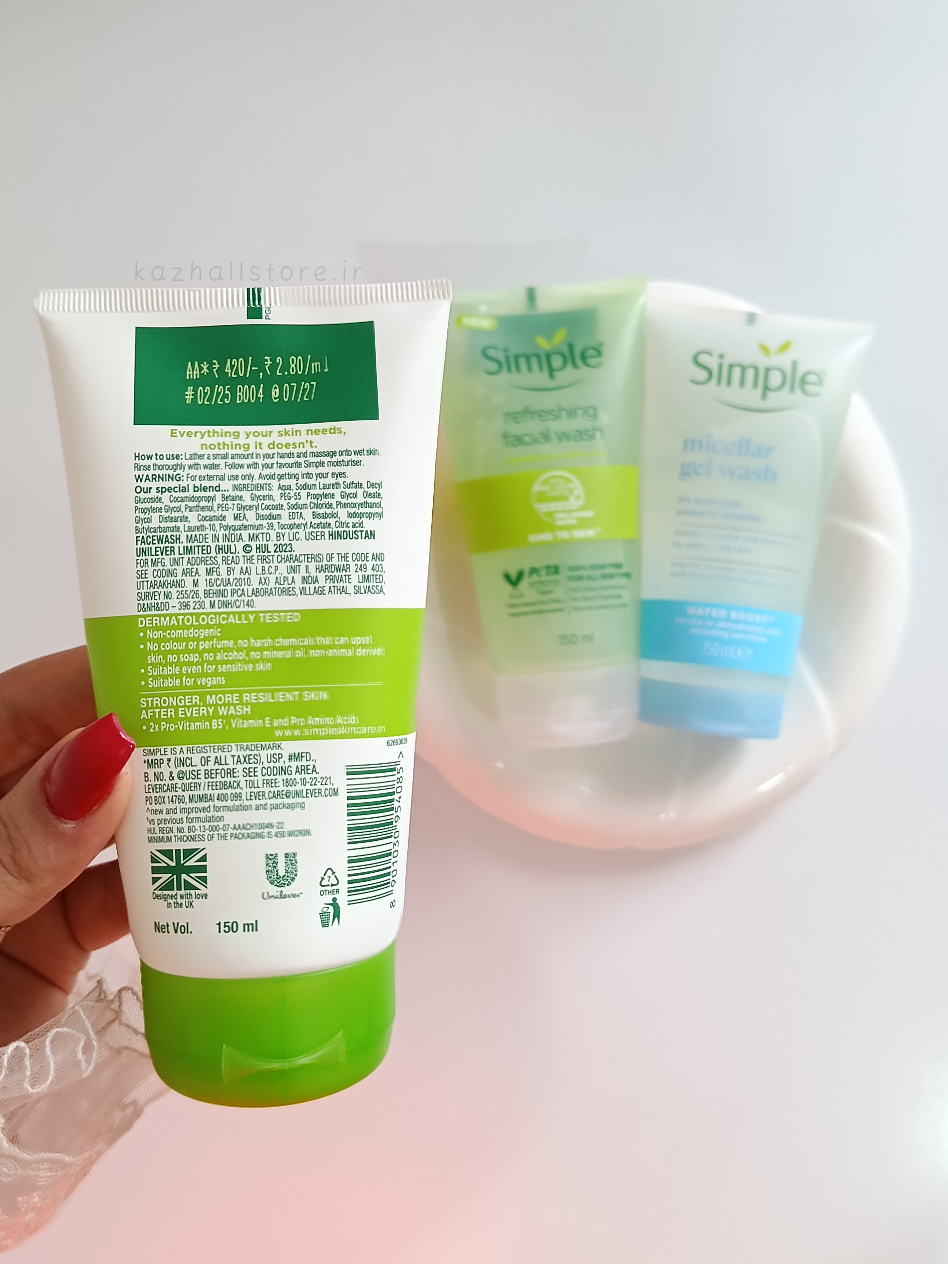 ژل شوینده صورت سیمپل یک محصول مناسب برای پوست خشک و حساس است. بافت این ژل بسیار سبک بوده و خیلی راحت پوست را از آلودگی و انواع مواد آرایشی پاکسازی میکند. این ژل فرمولاسیون بسیار خوبی دارد و هیچ حساسیتی روی پوست ایجاد نمیکند.